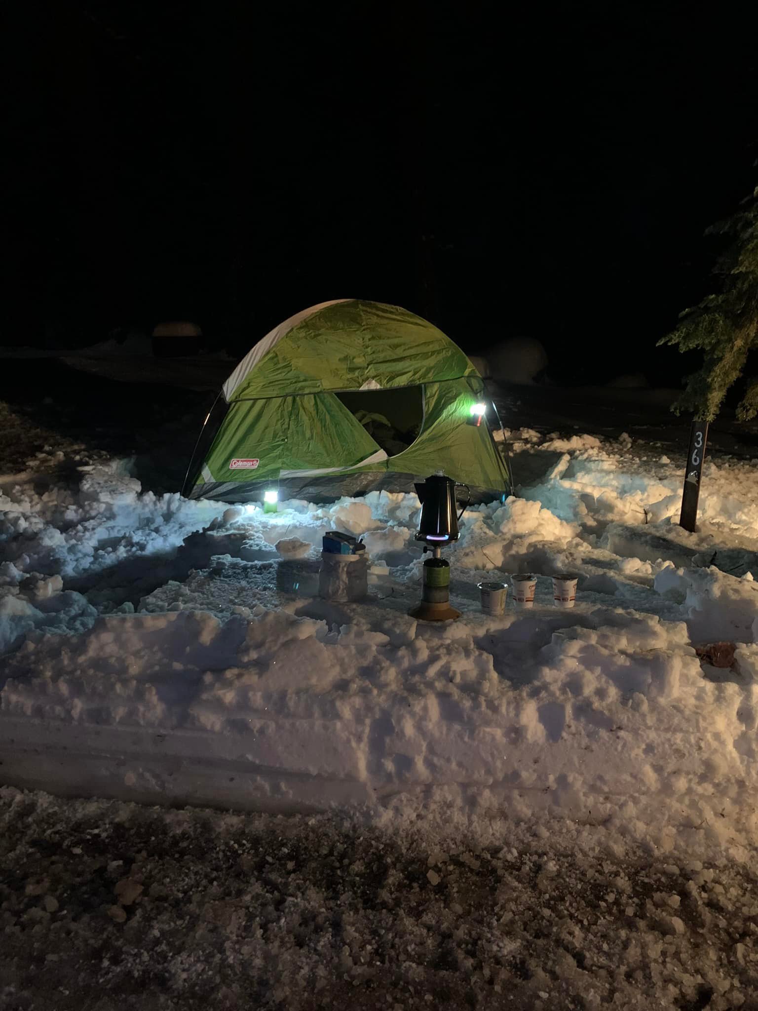 How to survive in a tent (in the snow): Camping in the snow was to be a new endeavor for TGOT and for our good friend, Grace Muldoon, who has incidentally known both Anna and Maddie for longer than the have known each other. Step one, as always, was research. Step two was gear acquisition. Maddie bought chains for her car and everyone got crampons for their boots and new ski pants/bibs. Maddie also bought an INTENSE shovel with a second handle for leverage, which proved very useful in SKCNP. Step three was plotting a way to insulate our tent from the elements. We started with a thick, old school sleeping bag, then layered our sleeping bags, then us in our sleeping bags, then blankets on top, and finally used our snow pants and coats to add extra warmth on the sides of the tent. Truthfully, we all shed layers each night, so we may have done the job TOO well.